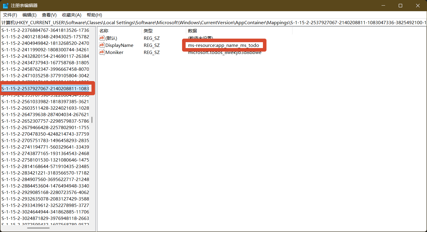 通过查找找到ToDo应用的SID,大概率大家的前面几位都是一样的,可以直接按照这个查找: