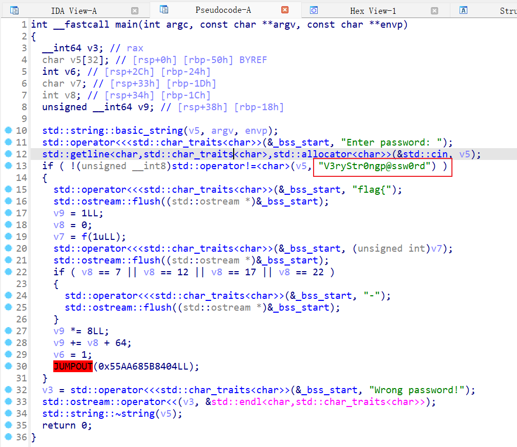 发现密码是V3ryStr0ngp@ssw0rd,后续采用了f函数进行操作: