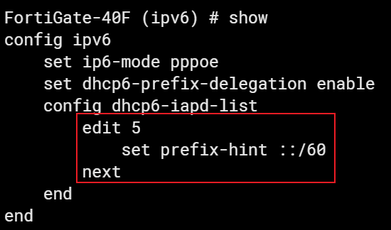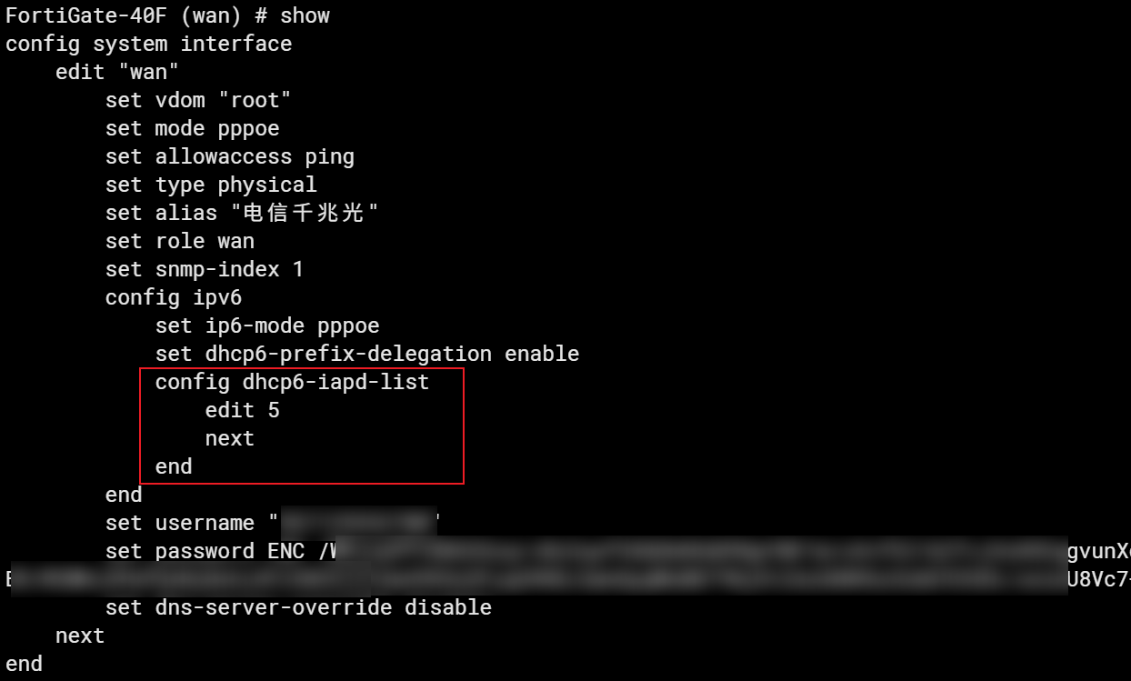以上为WAN接口启动了PPPoE下的IPv6地址获取,并配置了前缀委托,此时再使用show命令查看WAN接口,可看到自动添加的IAPD 5前缀提示: