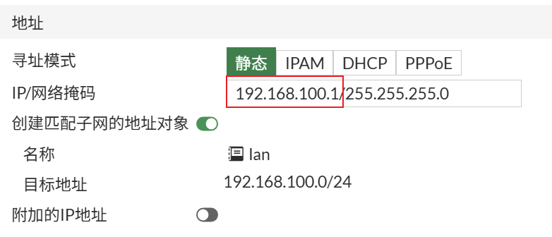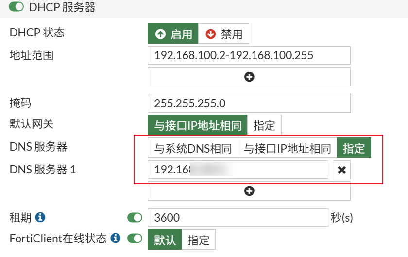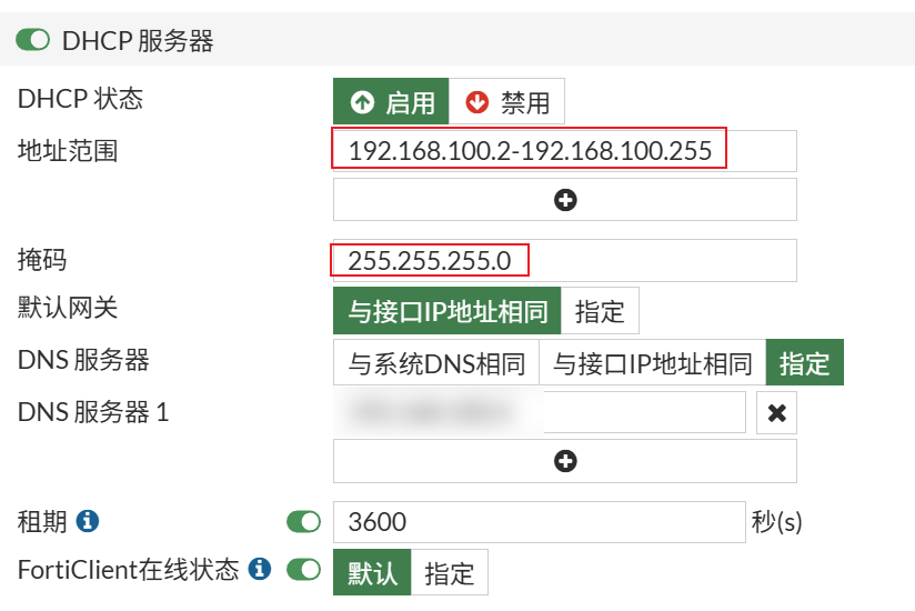 这样就使得飞塔位于192.168.100.1,DHCP在192.168.100.2-192.168.100.255处,符合我原来的内网配置。