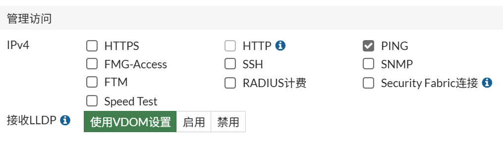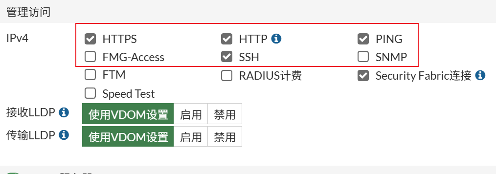 下面的管理访问区域建议只选择Ping,避免飞塔控制台暴露在外网: