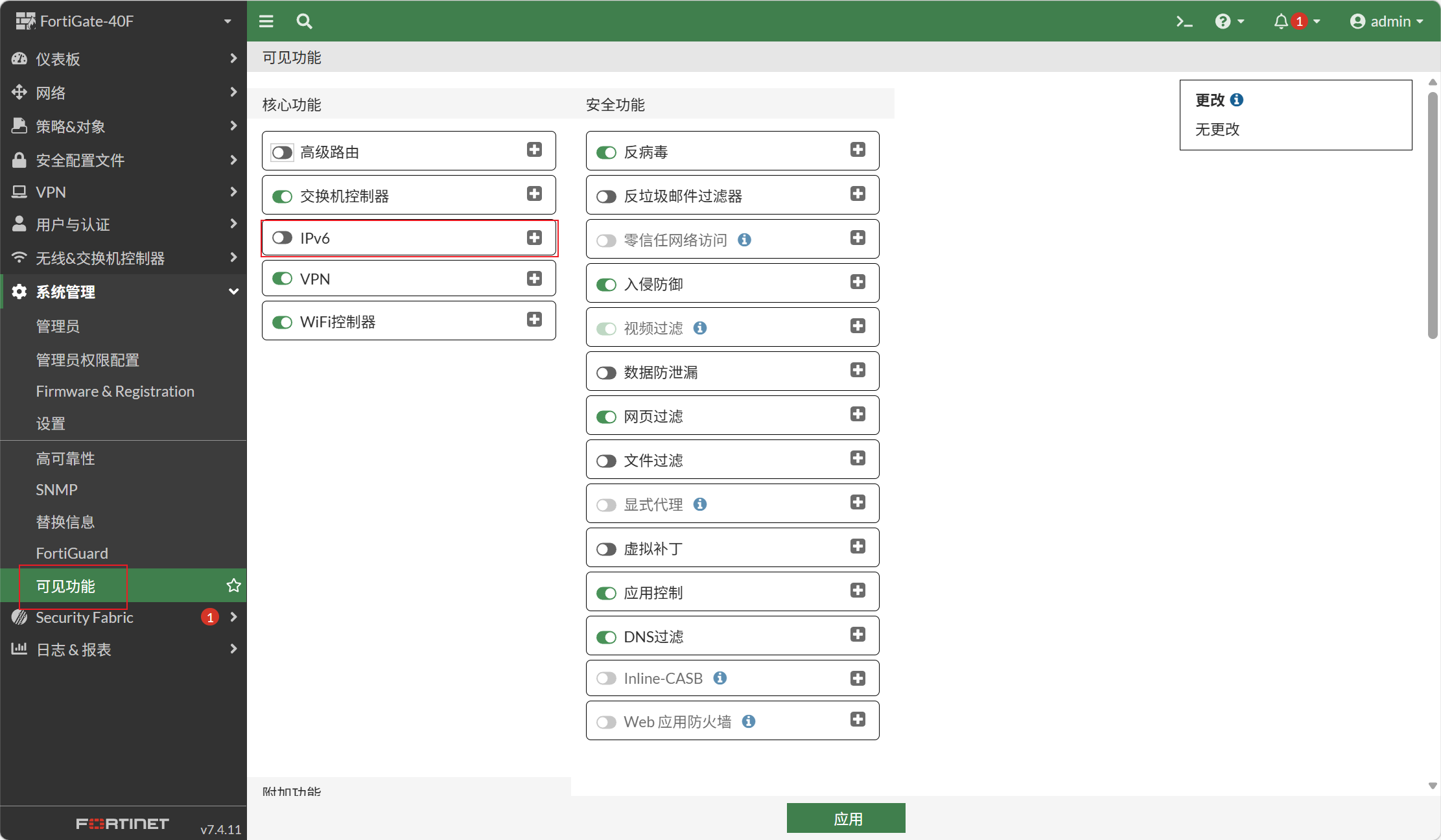 首先飞塔防火墙的配置下,打开IPv6配置。如下位置: