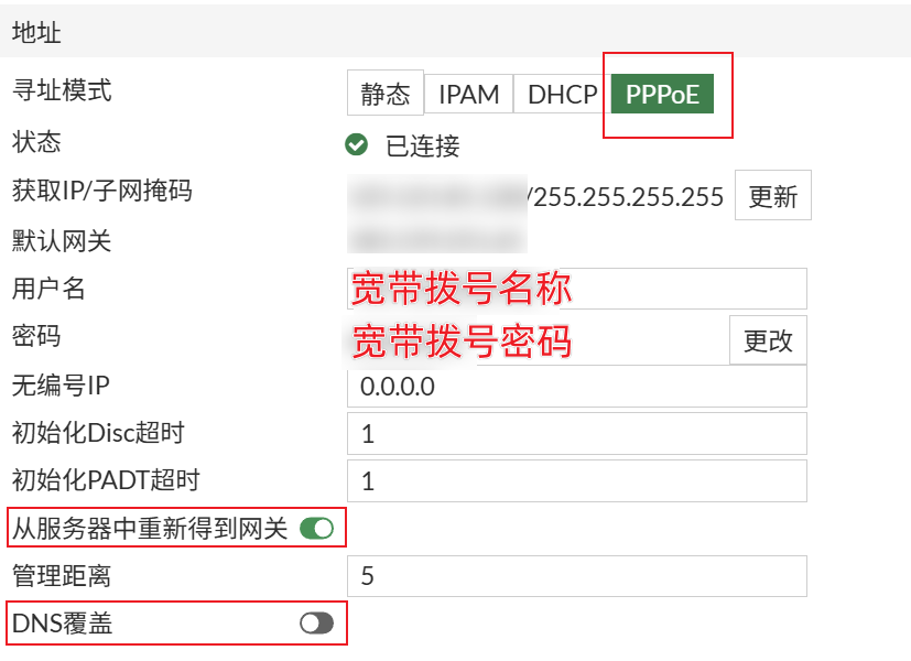 注意要关闭DNS覆盖选项,避免上游PPPoE拨号传来的DNS覆盖内网DNS。